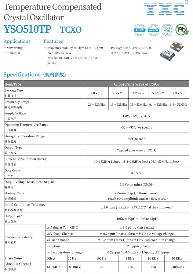 YXC晶振YSO510TP系列,频率为10-52MHz,封装尺寸多种可选:2.0x1.6/2.5x2.0/3.2x2.5/5.0x3.2/7.0x5.0,其最小尺寸可做到2016,以下为YSO510TP系列规格书。