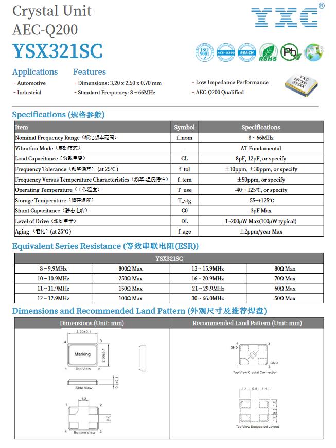 YXC晶振YSX321SC系列,频率为20MHz,总频差±80PPM,以下为YSX321SC系列规格书。
